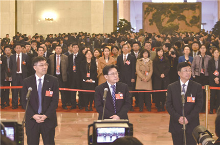 圖為全國人大代表、浪潮集團有限公司董事長兼首席執行官孫丕恕(左)轉型升級 全國人大代表、三一集團有限公司董事長梁穩根(中)轉型升級 全國人大代表、沈陽鼓風機集團股份有限公司董事長戴繼雙(右)在代表通道接受采訪。